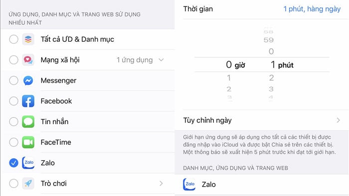 Tiếp theo, bạn quay lại mục App Limits (giới hạn ứng dụng) - Add Limit (thêm giới hạn) và thêm các ứng dụng cần khóa vào danh sách, thiết lập khoảng thời gian là một phút rồi nhấn Add (thêm).