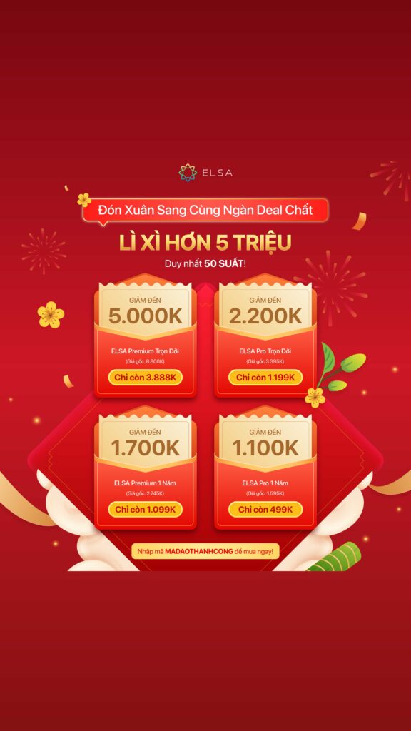 Hot: ELSA Speak vừa mở bán trở lại gói ELSA Pro, ELSA Premium với phiên bản 2025 cực xịn sò. Mừng quay trở lại với diện mạo mới – Elsa Premium, Elsa Pro giảm GIẢM GIÁ HẤP DẪN trong duy nhất hôm nay.