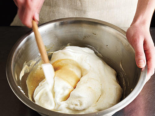 - Bước 4: Trộn lòng trắng đã bông vào hỗn hợp lòng đỏ, chia làm 2 lần sẽ dễ trộn hơn. Nên trộn bằng phới đánh trứng, trộn trái chiều kim đồng hồ và không đổi vòng, đừng trộn kĩ quá bột sẽ bị xẹp. Nếu vẫn thấy hỗn hợp lòng đỏ chìm dưới đáy tô thì lấy spatula vét quanh thành âu hất lên trên, làm vậy 4 - 5 lần là hoàn toàn đều rồi.