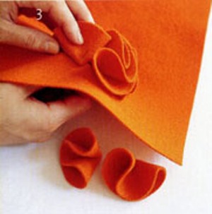 ![]() | Bước 2:Mỗi hình tròn vải được gập lại làm tư (gập đôi hai lần liền nhau) tạo thành các bèo vải nhỏ. Bạn dùng kim ghim để giữ ổn định nếp gập. |