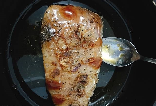 Ướp cá với gia vị mắm, tiêu, đường, dầu hào, hành tím phi, dầu ăn. Để thấm 30 phút