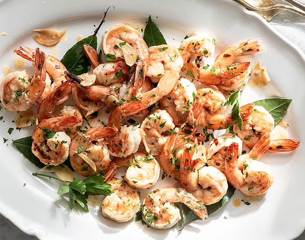 Tôm PTO xẻ lưng đông lạnh, rượu trắng, lá nguyệt quế, bơ, dầu ăn, tỏi,