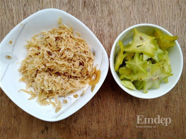 Bước 1: Tép moi khô rửa sạch nhiều lần với nước để loại bỏ bụi cát sau đó để tép ráo nước. Khế chua rửa sạch, cắt bỏ diềm ngoài rồi thái khế thành lát dày khoảng 2mm.