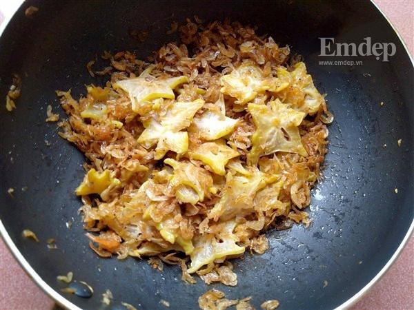 Bước 4: Đổ tép chiên vào chảo khế, nêm thêm chút muối, hạt nêm, đường, nước mắm rồi đảo đều cho tép khô và thấm gia vị là xong.