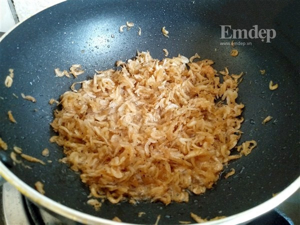 Bước 2: Đun nóng 60ml dầu ăn trong chảo, cho tép vào chiên chín vàng thì vớt ra bát.
