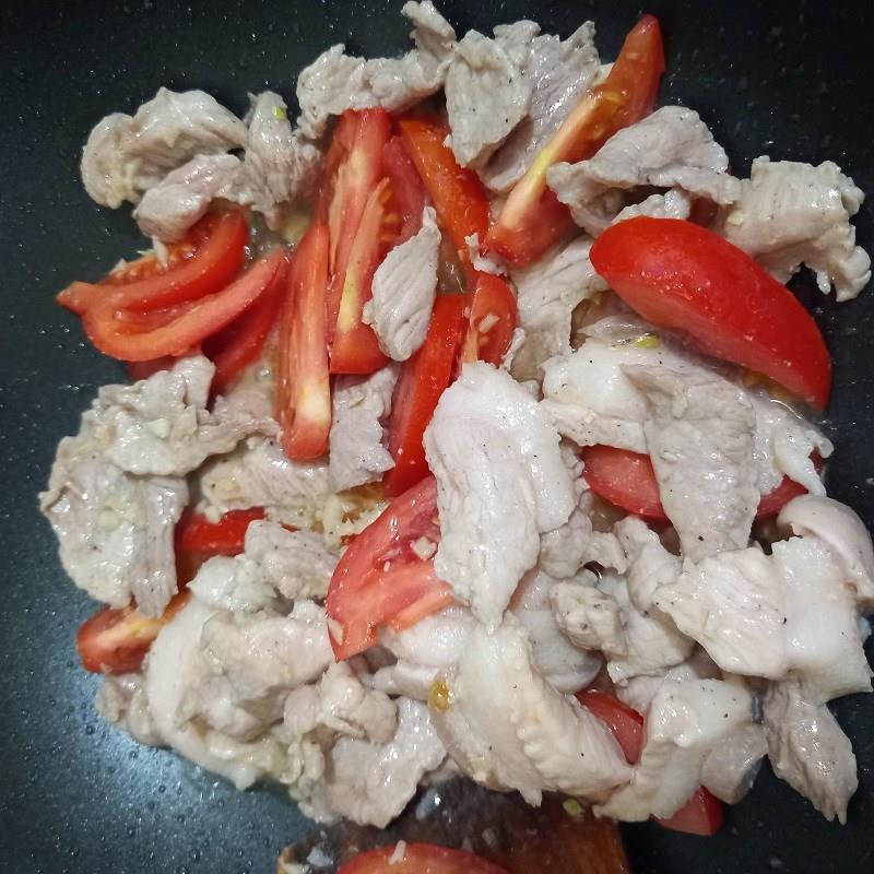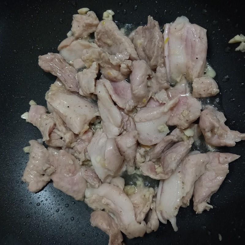 Bắc chảo lên bếp, bật lửa lớn đun nóng 2 muỗng canh dầu ăn rồi cho chỗ tỏi băm còn lại vào phi thơm, tiếp đến cho thịt lợn vào đảo cho săn.