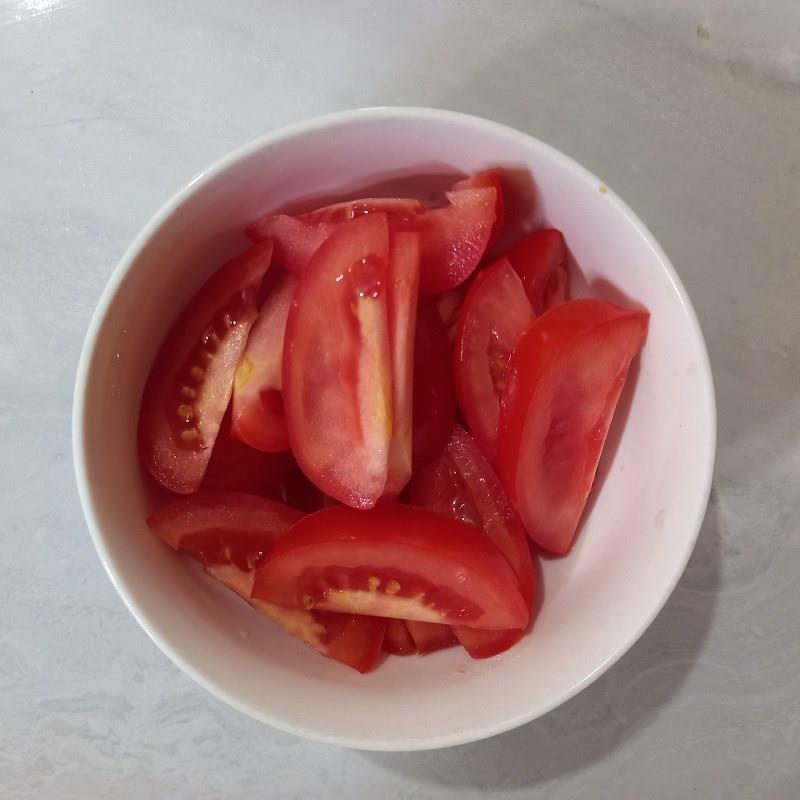 Cà chua cắt bỏ cuống, rửa sạch, cắt múi cau. Hành lá nhặt bỏ lá úa, rửa sạch, cắt khúc. Tỏi bóc vỏ, băm nhỏ.