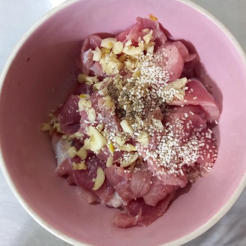 Cho thịt vào chén trộn đều với 1 muỗng cà phê hạt nêm, 1/2 muỗng cà phê bột ngọt, 1/2 muỗng cà phê tiêu xay, 1/2 chỗ tỏi băm. Ướp khoảng 10 phút để thịt thấm gia vị.