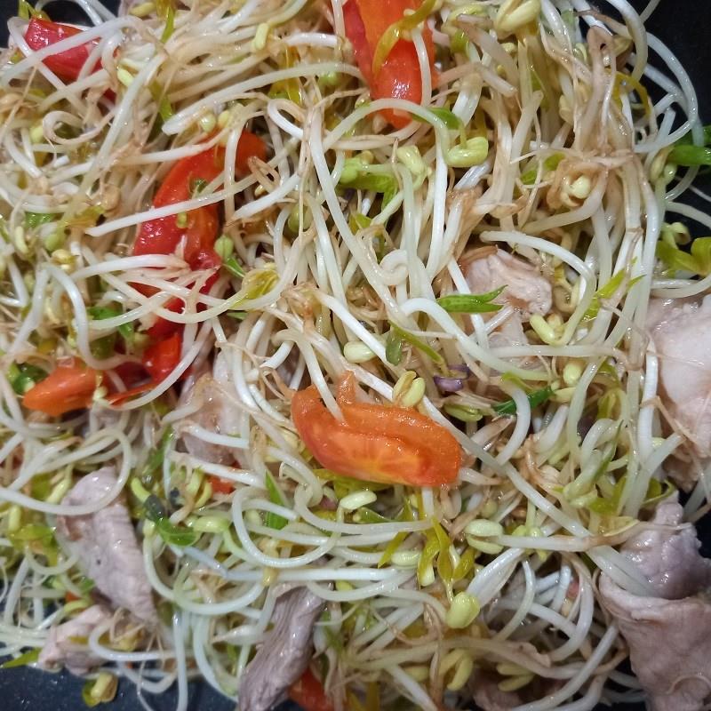 Tiếp đến, cho cà chua vào xào cùng thịt, cà chua mềm thì cho giá đỗ vào, nêm 1 muỗng cà phê hạt nêm, 1 muỗng cà phê dầu hào, 1/2 muỗng cà phê đường, đảo nhanh tay đến khi gia vị tan hết và giá vừa chín tới. Lúc này bạn nêm nếm lại cho vừa với khẩu vị, cho hành lá vào đảo thêm vài lần nữa, tắt bếp.