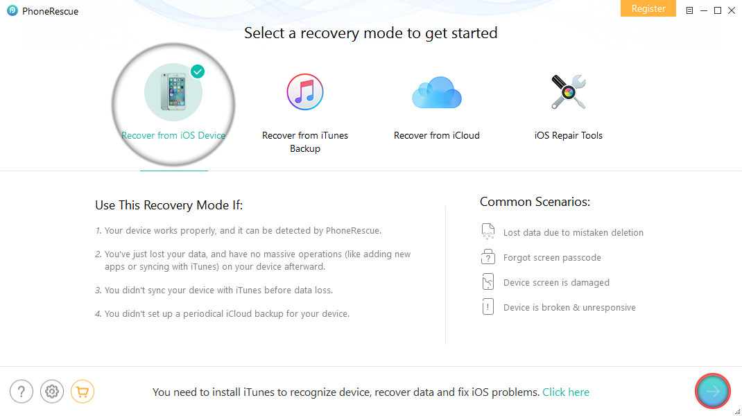 Hoàn thành cài đặt xong, bạn sẽ mở phần mềm trên giao diện máy tính. Tiếp theo, bạn sẽ mở giao diện PhoneRescue ->chọn mục Recover from iOS Device-> Bấm Right Arrow.
