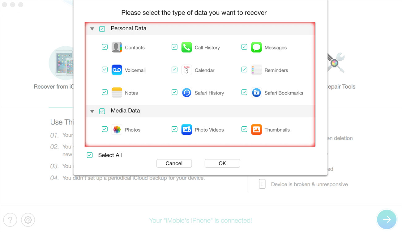 Đây là bước quan trọng thực hiện khôi phục dữ liệu từ thiết bị iOS và quét iPhone. Sau cùng, bạn sẽ chọn nút Next để tới bước chọn khôi phục nhật ký cuộc gọi.