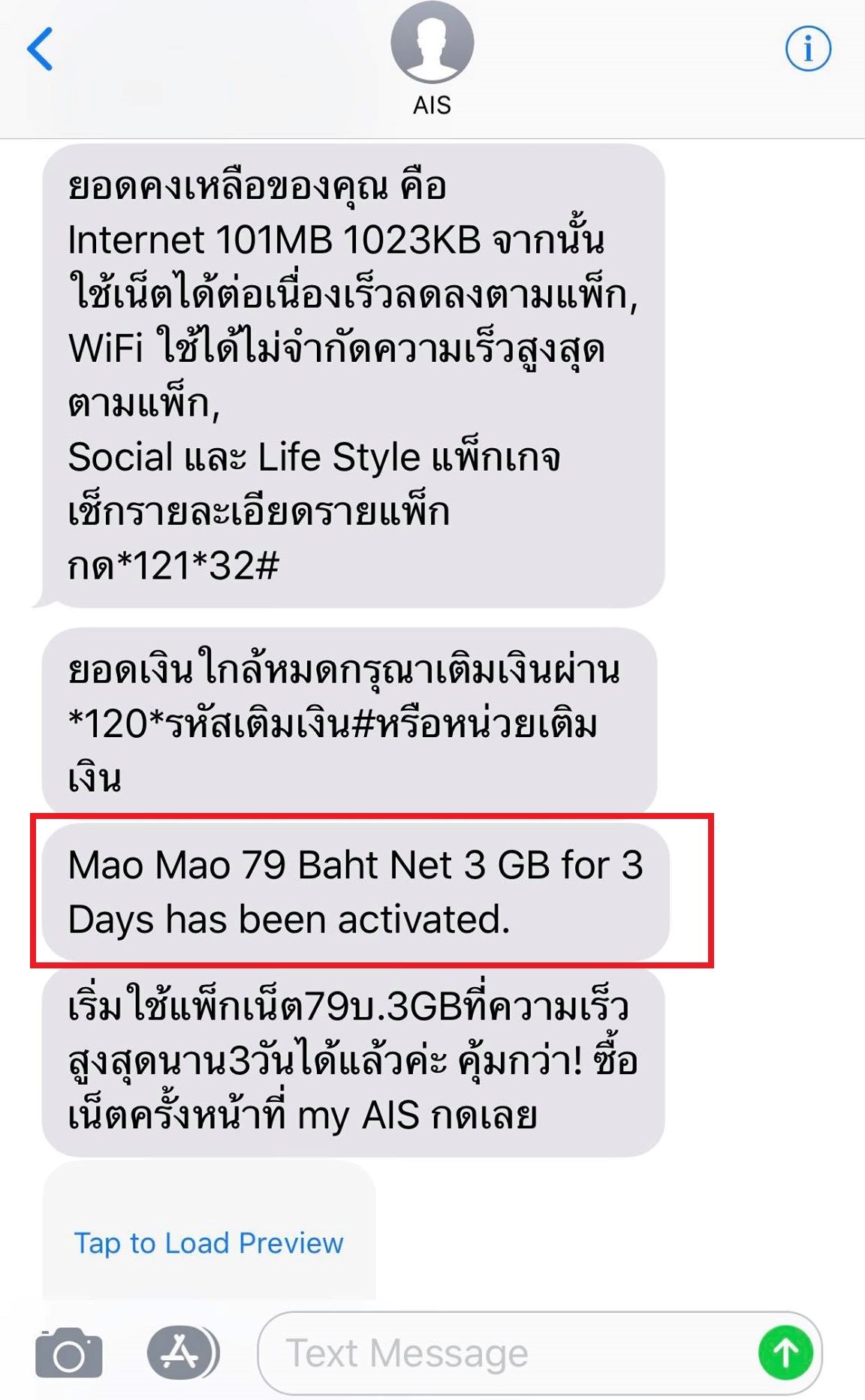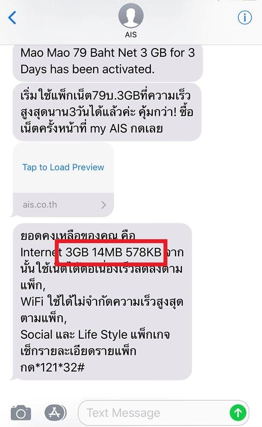 Bước 3: Bấm *777*7035# và nhấn gọi, bạn sẽ có thêm 1GB dung lượng để sử dụng trong 3 ngày, giá gói vào khoảng 70 Bạt (ngoài gói 1GB trong hướng dẫn sử dụng kèm theo còn chỉ cách mua các gói dung lượng 2GB, 3GB).
