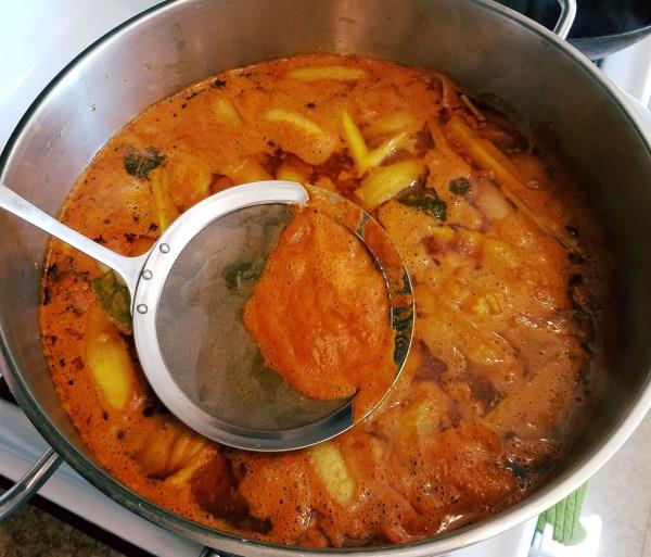 Cho phần nước cốt dừa đã được pha loãng vào 1 cái nồi lớn, đun sôi. Sau đó, cho thịt gà đã xào sơ vào nồi, đun khoảng 30 phút với lửa liu riu. Lưu ý phải đun sôi nước dừa trước để tránh nước cà ri bị chua và khi hầm gà phải hớt bọt thật kĩ để nước trong. Sau khoảng 30 phút, chọc đũa vào thịt gà thấy mềm thì cho khoai tây, khoai lang và cà rốt vào nồi hầm tiếp.