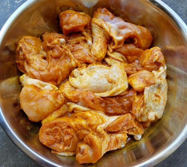 Cho khoai lang và khoai tây lên chảo chống dính, chiên sơ với dầu ăn để khoai thơm hơn và không bị nát khi nấu. Hành tây gọt vỏ, rửa sạch, thái múi cau. Sả củ bóc vỏ ngoài, cắt đầu đuôi, rửa sạch, cắt khúc khoảng 5cm rồi đập dập để xả tiết ra mùi thơm. Hành tím, tỏi bóc vỏ, rửa sạch, đập dập rồi băm nhuyễn. Bước 2: Ướp thịt gà và làm nước cốt dừa Cho thịt gà đã được chặt thành miếng bỏ vào bát, cho thêm hành tím, tỏi băm nhuyễn, bột cà ri, bột nghệ cùng với các gia vị sau: 2 thìa nước mắm, 2 thìa bột nêm, 1 thìa đường vào, trộn đều. Ướp khoảng 2 – 4 tiếng hoặc để qua đêm để thịt ngấm đều gia vị.