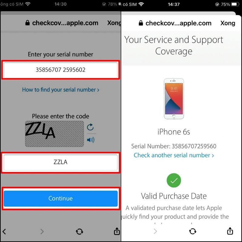 Sau khi tìm được dòng mã số IMEI bạn hãy nhấn giữ và sao chép mã số ấy lại > Truy cập vào trang web checkcoverage để kiểm tra thông tin. Bạn hãy dán mã IMEI vừa sao chép vào khung Enter your serial number và nhập mã xác thực bên dưới để tiến hành kiểm tra. Nếu iPhone của bạn là thiết bị chính hãng website sẽ hiển thị thông tin máy ngược lại nếu hàng xách tay website sẽ không hiện thông tin cho bạn.