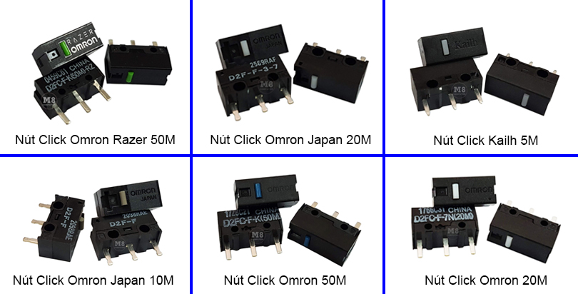 Nút Click Omron thì phổ biến hơn trong các dòng chuột cao cấp, phân loại rõ ràng 10M, 20M, 50M. Có hẳn dòng 50M-60M của Razer hoặc nút click Omron Japan (nhập khẩu Nhật) dùng cực bền và tốt