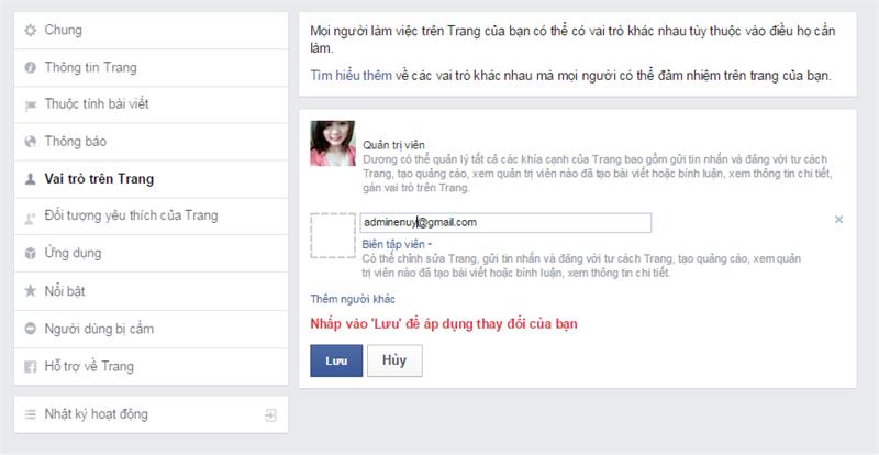 Sau khi tạo Fanpage Facebook bán hàng, bạn có thể tiến hành phân quyền quản trị trên trang nếu bạn muốn thêm người cùng quản trị Fanpage. Để làm điều này, bạn vào phần Cài đặt, sau đó chọn tiếp Vai trò trên trang. Tại đây, bạn có thể thêm người mới bằng tên hoặc email của họ, sau đó phân quyền quản trị trên trang bao gồm Quản trị viên, Biên tập viên, Người kiểm duyệt, Nhà quảng cáo hoặc Nhà phân tích với các quyền hạn khác nhau rồi ấn nút Lưu.