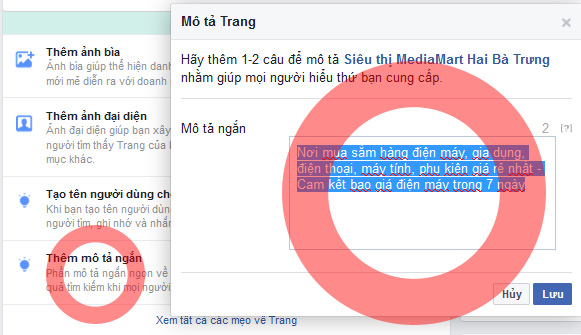 Ở bước này bao gồm việc Thêm mô tả cho trang để cho mọi người biết nội dung Fanpage của bạn. Đây là phần thông tin bắt buộc, bạn có thể viết một đoạn ngắn giới thiệu về thương hiệu hoặc sản phẩm của mình, số điện thoại liên hệ. Ngoài ra, Facebook còn yêu cầu bạn Thêm địa chỉ website của bạn nếu có, tuy nhiên phần này là không bắt buộc. Sau đó click vào Lưu thông tin.