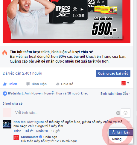3. Quản lý bình luận và thành viên Khi quản trị Fanpage Facebook bán hàng, nếu xuất hiện các bình luận không phù hợp hoặc bạn muốn ẩn bình luận của khách hàng để tránh các đối thủ cạnh tranh lấy thông tin khách hàng, bạn chỉ cần di chuyển chuột đến bình luận đó và ấn dấu X để ẩn bình luận. Ngoài ra nếu muốn chặn các thành viên bình luận không phù hợp hoặc thiếu lịch sự chỉ cần chọn Chặn là thành viên đó không thể tương tác được trên Fanpage Facebook bán hàng của bạn. Để bỏ chặn, bạn vào phần Cài đặt đến mục Thành viên bị cấm rồi tiến hành chọn thành viên và bỏ chặn.