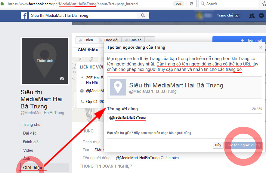 - Đặt tên Người dùng (Cũng chính là URL để truy cập sau này) (VD: https://www.facebook.com/MediaMart.HaiBaTrung ) Sau đó nhấn nút "Tạo tên Người dùng"