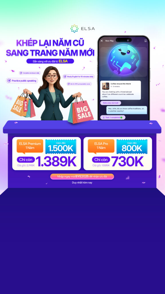 Hot: ELSA Speak vừa mở bán trở lại gói ELSA Pro, ELSA Premium với phiên bản 2025 cực xịn sò. Mừng quay trở lại với diện mạo mới – Elsa Premium, Elsa Pro giảm GIẢM GIÁ HẤP DẪN trong duy nhất hôm nay.