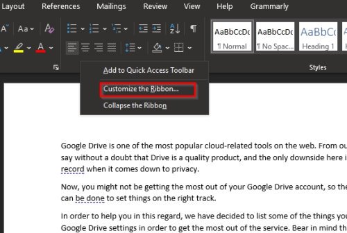 Để thực hiện việc này, hãy click chuột phải vào phần trống của Thanh công cụ và từ đó, chọn Customize the Ribbon để mở một cửa sổ mới.