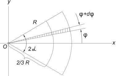 Cách dễ nhất để tính tích phân này là chia miền tích phân thành các cung cơ bản với một góc dφ . Tối đa là các chỉ số nhỏ nhất của bậc đầu tiên, một khu vực như vậy có thể được thay thế bằng một hình tam giác có cơ sở bằng R × dφ và chiều cao R. Diện tích của một tam giác như vậy dF =(1/2)R 2 ∙ dφ , và trọng tâm của nó là 2/3 R từ trên cùng, vì vậy trong (5) chúng tôi đặt x = (2/3)R∙ cos. Thay thế thành (5) F= α R 2, chúng tôi nhận được: