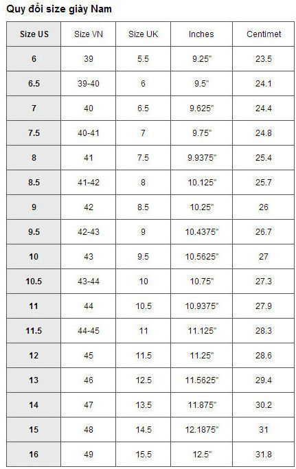 Bảng Size Giày CHUẨN Việt Nam Và Quốc Tế Cho Bạn THAM KHẢO
