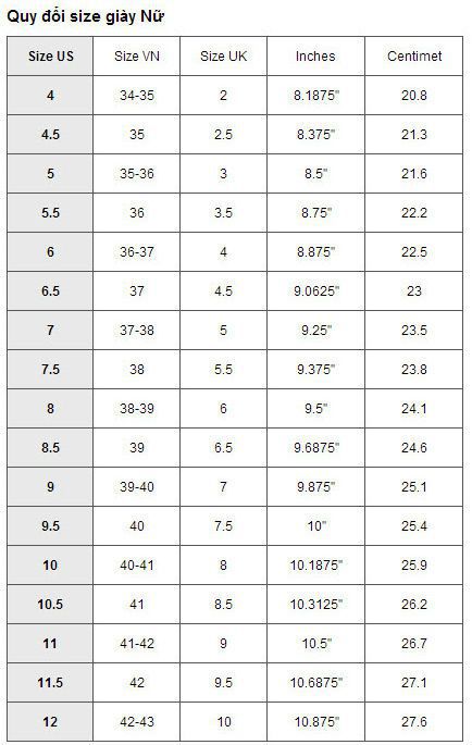 Bảng Size Giày Chuẩn QUY ĐỔI Size Việt Nam Và Quốc Tế