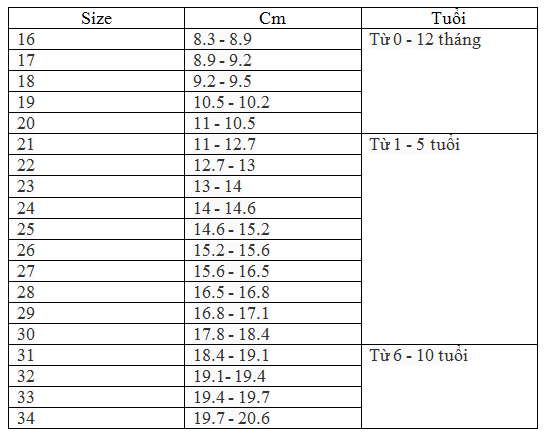 Bảng quy đổi cho trẻ em theo chuẩn Châu Âu