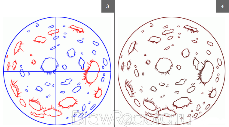 Hãy chuyển sang chi tiết các miệng núi lửa của Sao Hỏa, vẽ tất cả các miệng núi lửa chi tiết hơn và như bạn đã thấy trong các ví dụ, chúng phải càng lồi càng tốt để tạo ra ảo ảnh về một hành tinh đáng tin cậy. Bây giờ bản vẽ của bạn gần như đã sẵn sàng và bạn đang tự hỏi điều gì tiếp theo? Vì vậy, nếu bạn chưa quên, ở bước đầu tiên, chúng tôi đã vẽ bốn đường phụ để dễ vẽ sao Hỏa hơn trong tương lai, hãy xóa tất cả bốn đường và thực sự điều này áp dụng cho tất cả các đường thừa và không cần thiết trong hình. Bây giờ bạn có thể an toàn chuyển sang bước thứ tư cuối cùng trong việc vẽ vũ trụ hay nói chính xác là hành tinh Sao Hỏa.