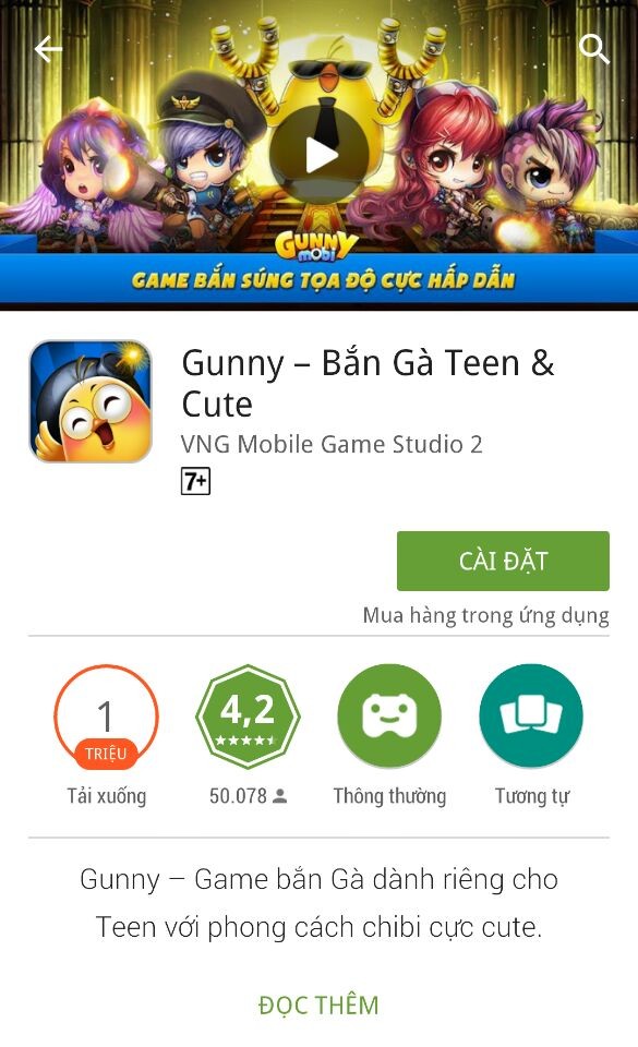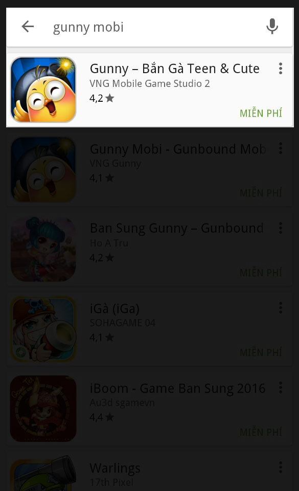 Lưu ý: Để tránh sự nhầm lẫn với các ứng dụng game khác, các bạn vui lòng chọn đúng tên “Gunny – Bắn Gà Teen & Cute” khi đã gõ “gunny mobi” trên thanh kiếm