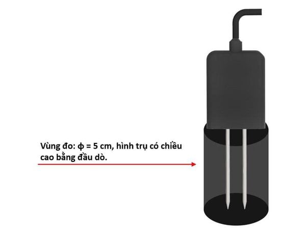 Khu vực hoạt động của cảm biến được xác định như sau: Khu vực hình trụ có đường kính 5cm, chiều cào bằng với chiều dài đầu dò của cảm biến và tâm của hình trụ sẽ trùng với vị trí chính giữ 2 đầu dò điện cực. Khu vực hoạt động được minh họa như hình sau:
