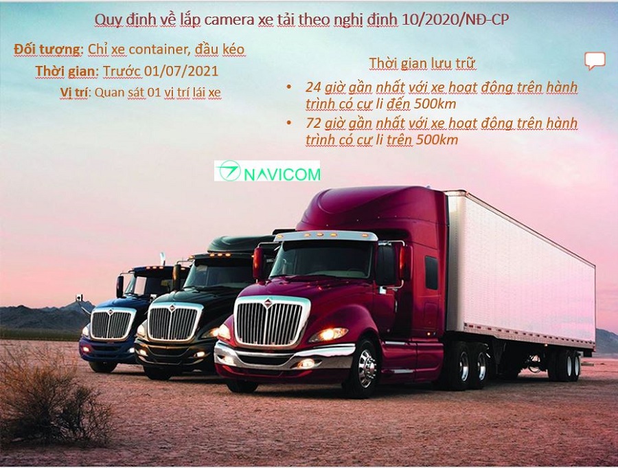 "Trước ngày 01 tháng 7 năm 2021, xe ô tô kinh doanh vận tải hàng hoá bằng công-ten-nơ, xe đầu kéo phải lắp camera đảm bảo ghi, lưu trữ hình ảnh của người lái xe trong quá trình xe tham gia giao thông.
