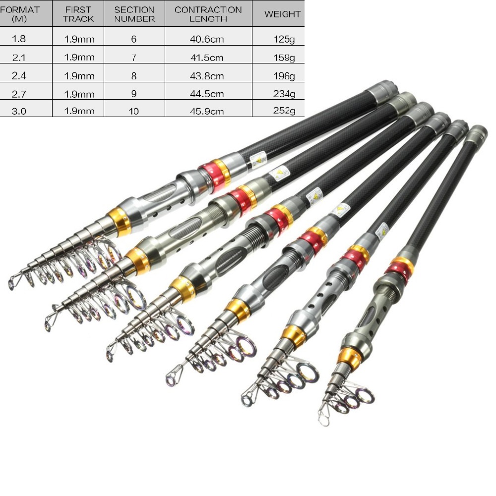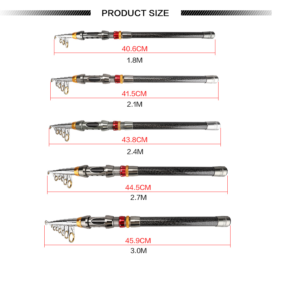 cần câu máy rút có các kích thước 2m1, 2m4, 2m7 và 3m. cần rút có chiều dài thu gọn với 45cm, nhỏ gọn và tiện lợi giúp bạn dễ mang theo trong những chuyến đi câu xa hoặc chuyến đi dã ngoại.