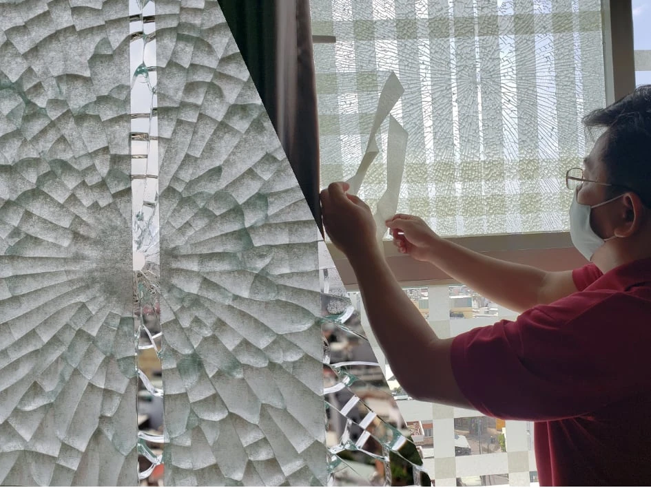 Anh V dùng keo dán lại kính sau khi bị đạn bi bắn bể. Ảnh: TS