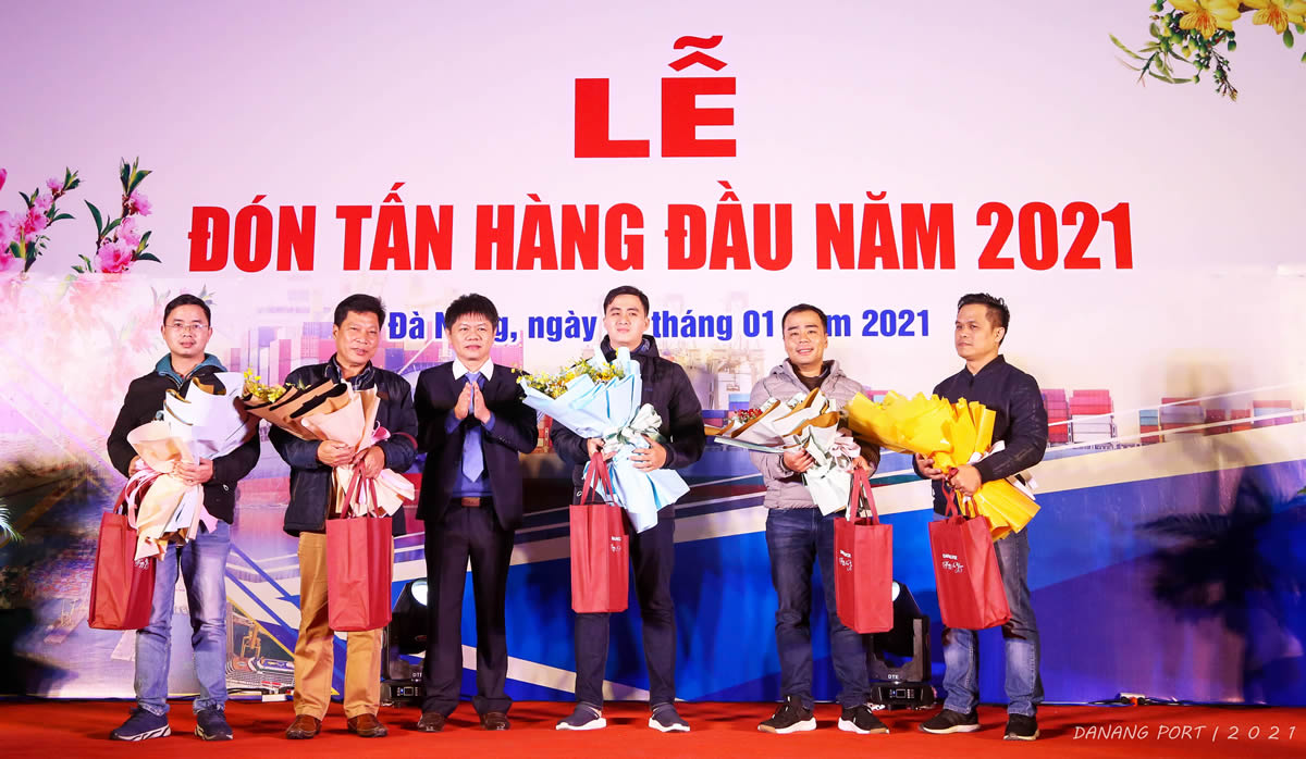 | Đại diện lãnh đạo Cảng Đà Nẵng chúc mừng năm mới, tặng hoa và quà động viên người lao động bốc dỡ tấn hàng đầu tiên của năm mới 2021. |