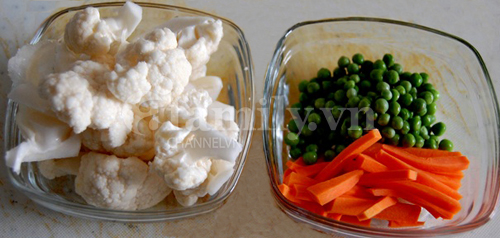 - Bông cải tách nhánh nhỏ, ngâm nước muối loãng, vớt ra. Cà rốt xắt miếng nhỏ.