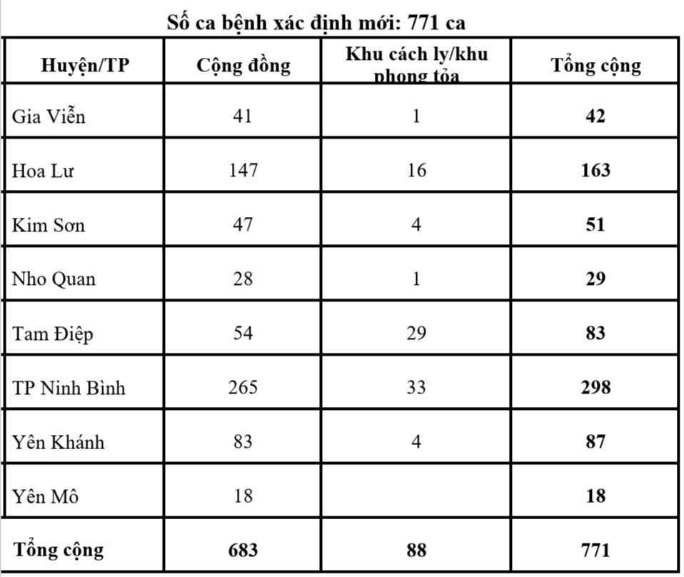 Tổng số ca bệnh hiện đang cách ly, điều trị là 6.602; trong đó tại Trạm Y tế/Trạm Y tế lưu động 5.625 ca; còn lại cách ly, điều trị tại các phòng khám Đa khoa khu vực và các Bệnh viện (Phổi, Phục hồi chức năng, Sản Nhi, Đa khoa tỉnh, Đa khoa huyện Nho Quan, Công an tỉnh, TTYT huyện Gia Viễn). Tổng số trường hợp đang được cách ly và giám sát là 12.626.