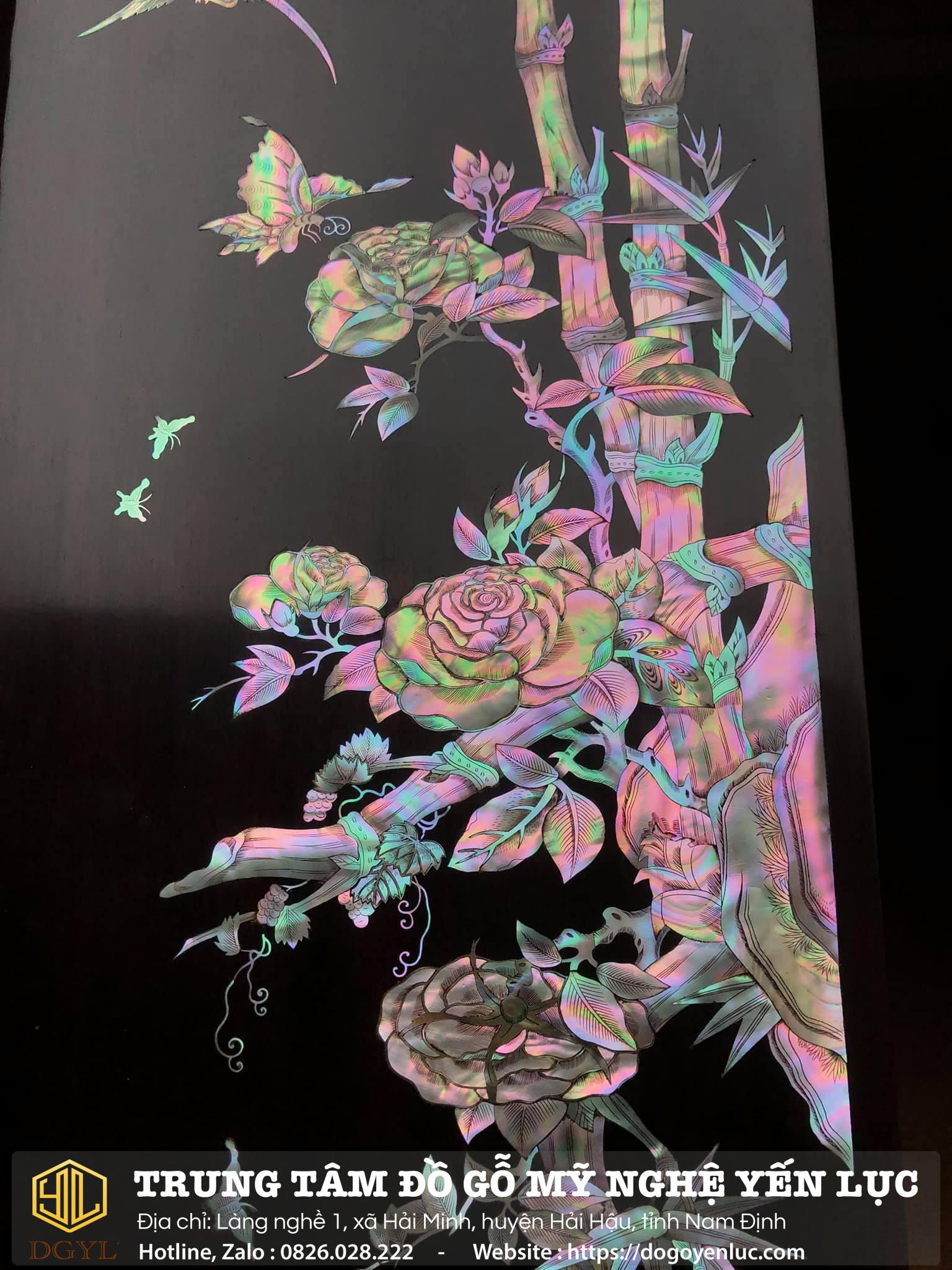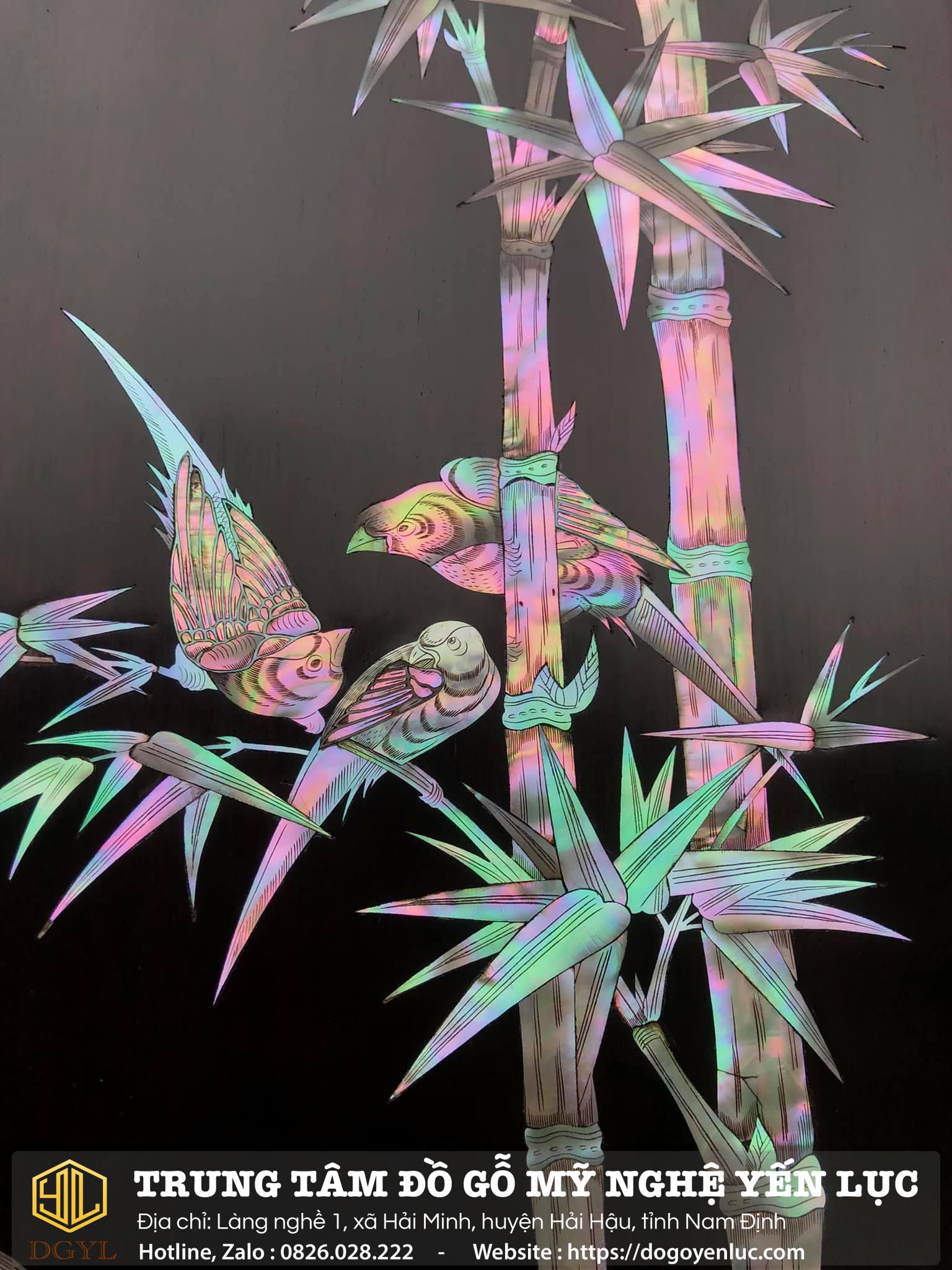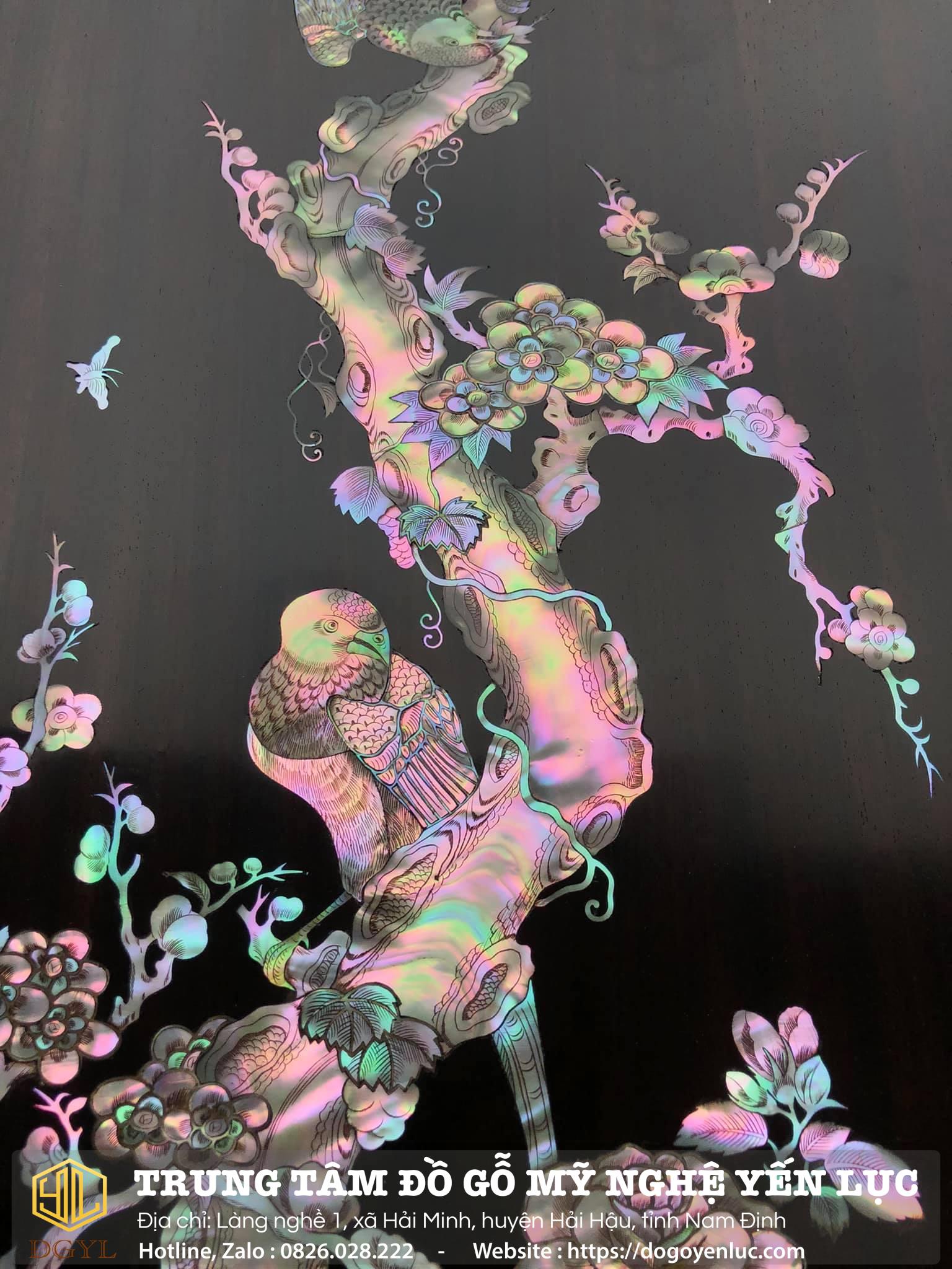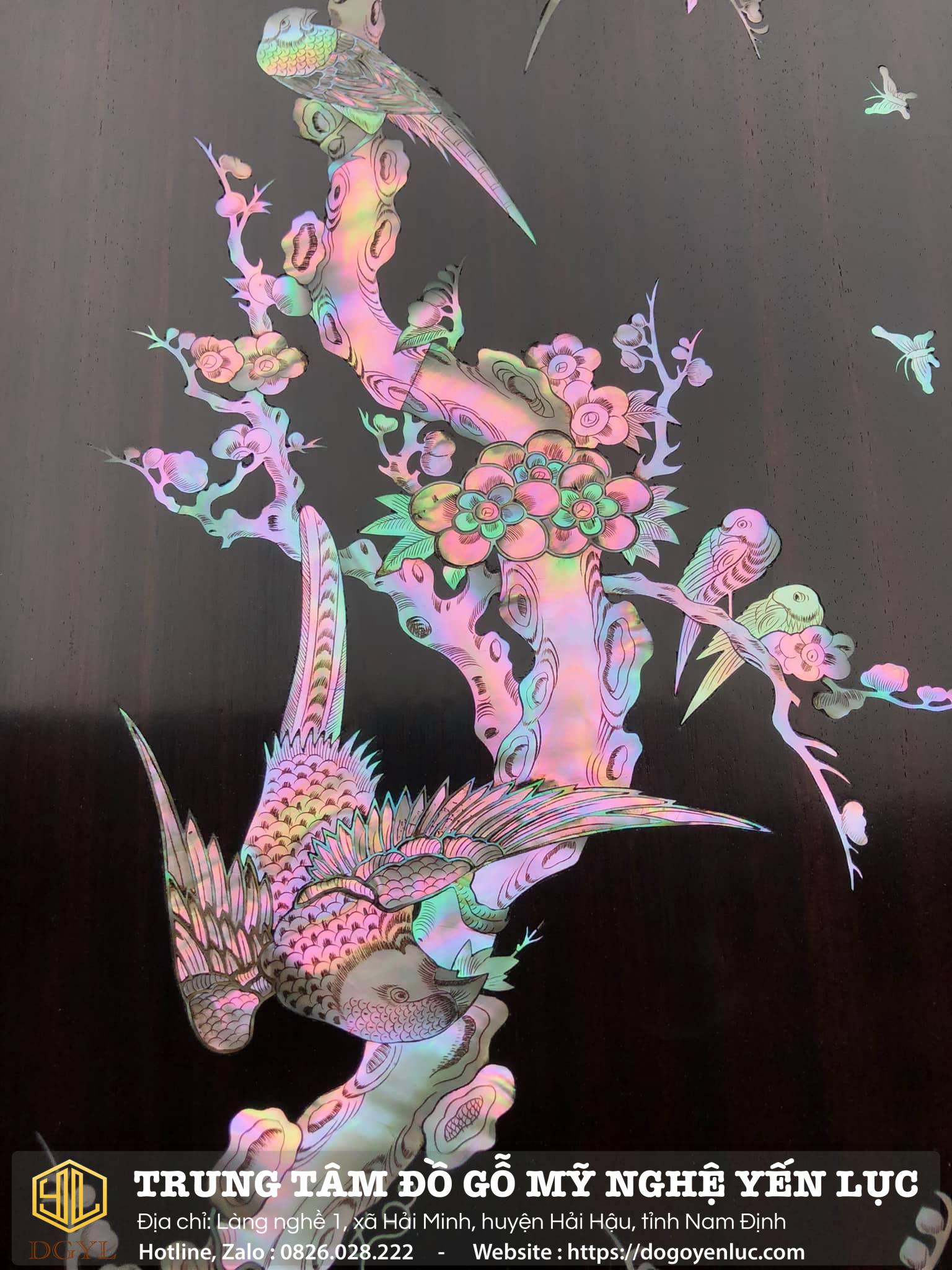 Tích mai điểu được khảm ốc trên nền gỗ gụ, có thể làm tranh treo câu đối phòng khách để chơi
