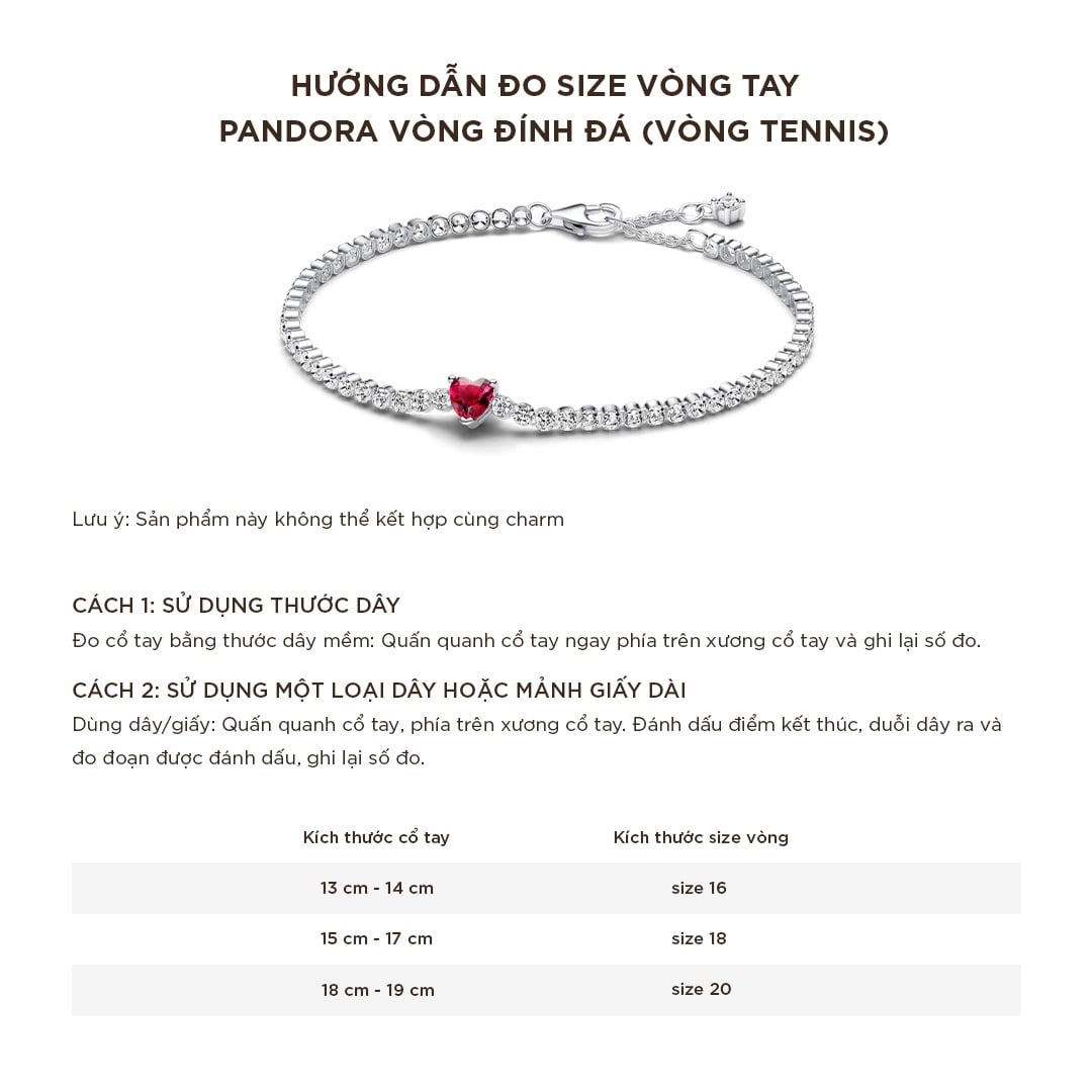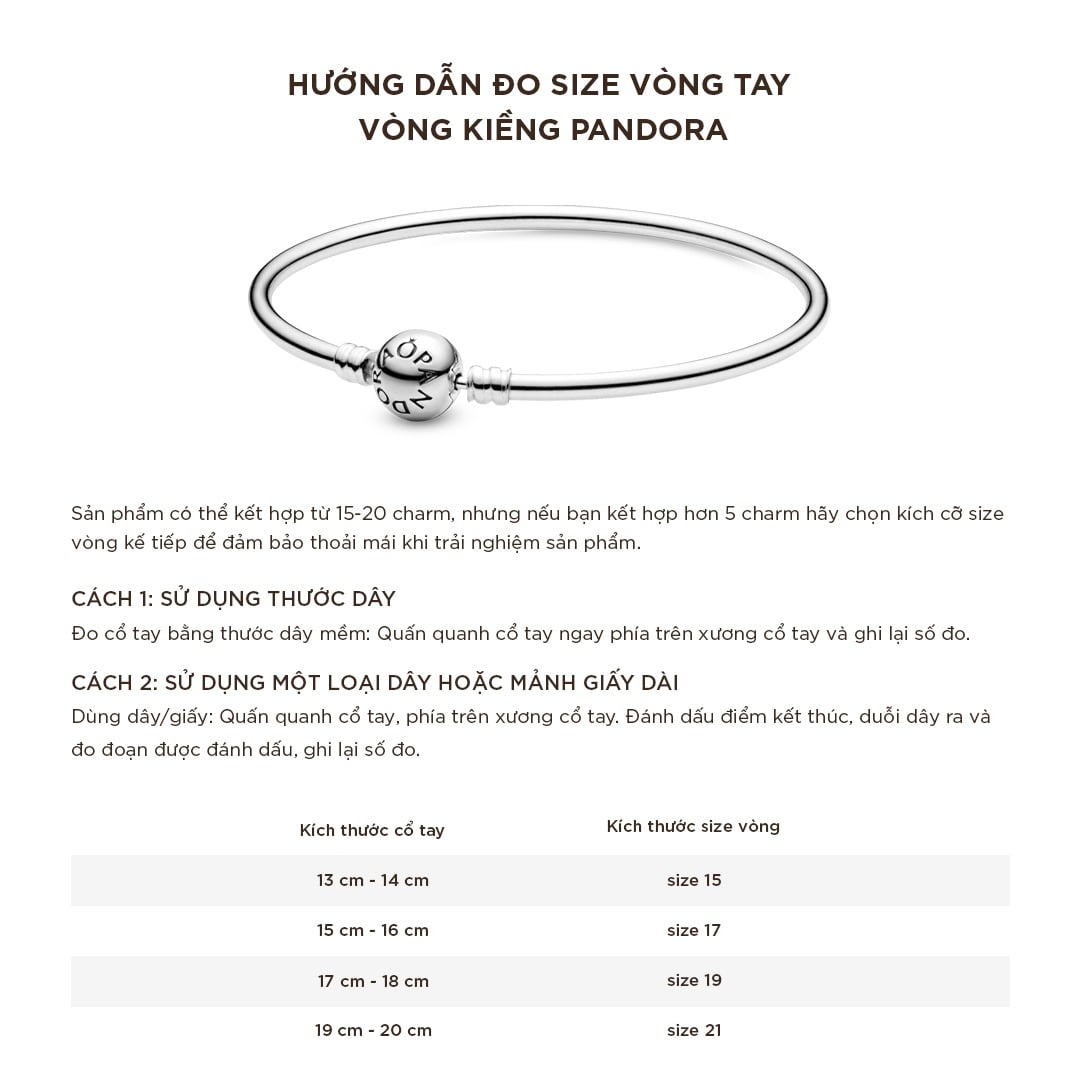 Dùng thước dây hoặc một sợi dây dài quấn quanh cổ tay để đo chiều dài cm (cỡ tay thông dụng từ 15cm-17cm) ở vị trí quanh cổ tay như trong hình bên dưới và lấy thước đo xem chiều dài dây là bao nhiêu.- Vòng tay Pandora mềm: Sau khi thực hiện xong việc đo cm cho cổ tay bạn có thể chọn được kích thước của tay như sau: