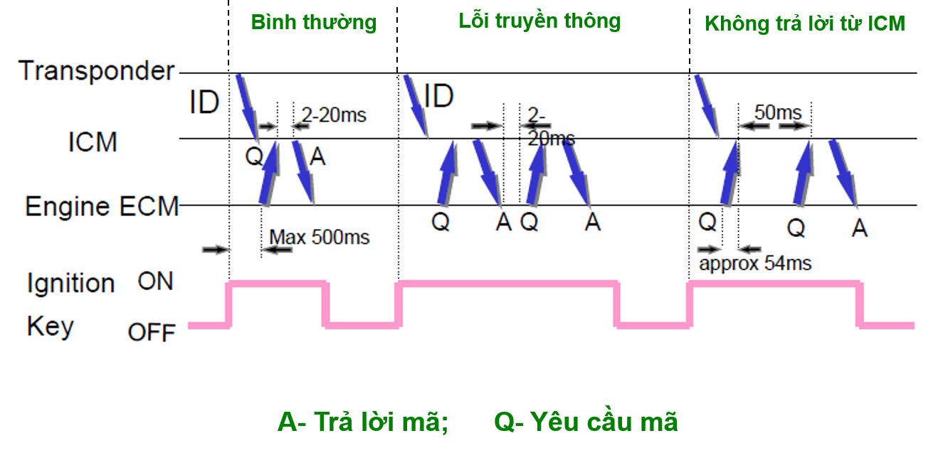 - ECM/PCM sau khi nhận tín hiệu được mã hóa sẽ nhận dạng tín hiệu này và điện áp sẽ được cung cấp để thực hiện bơm nhiên liệu và đánh lửa.