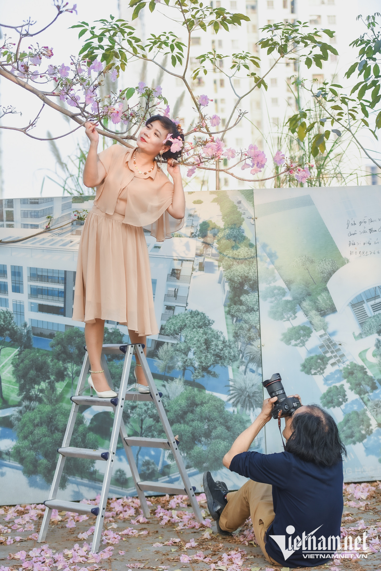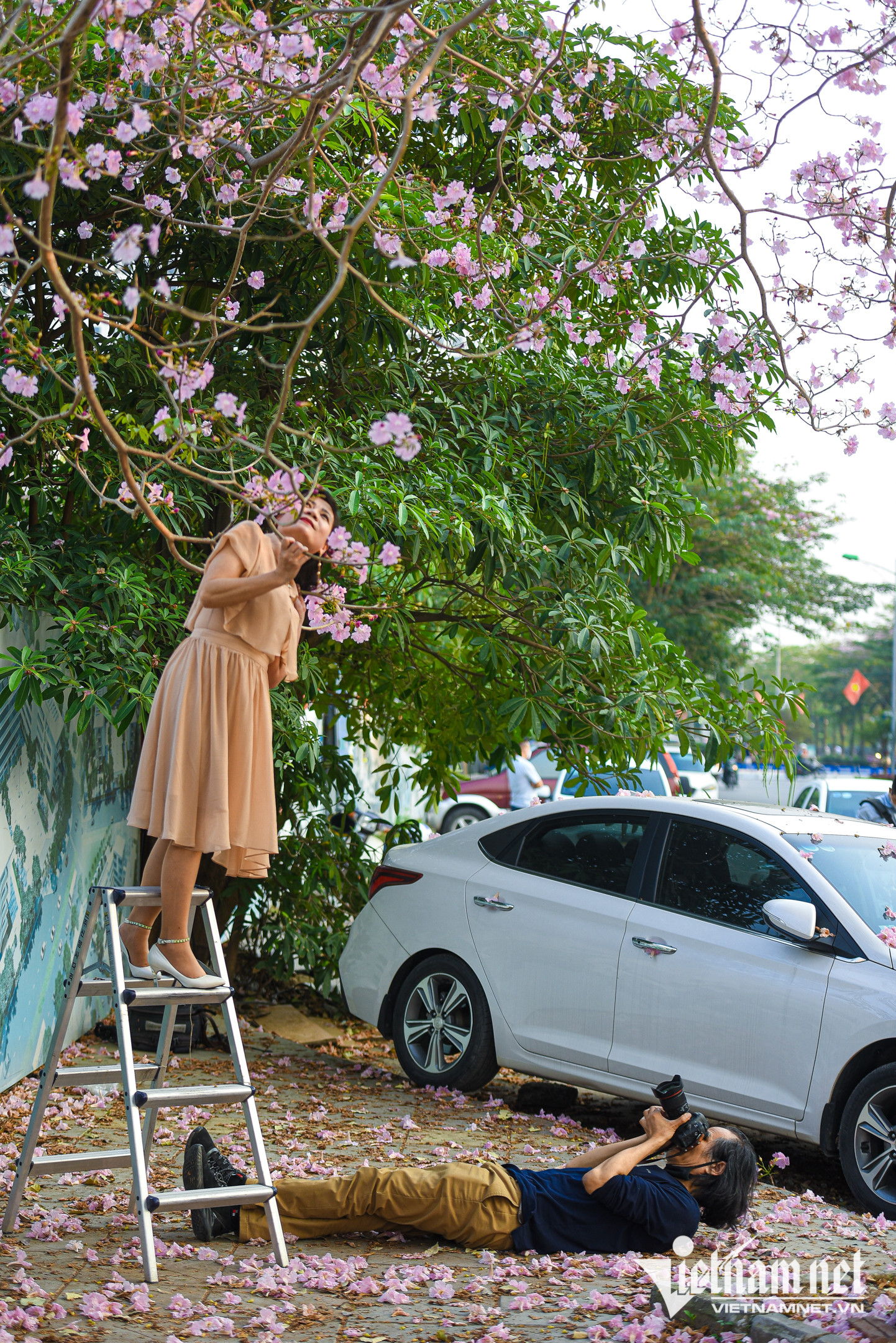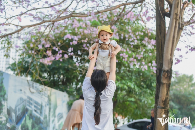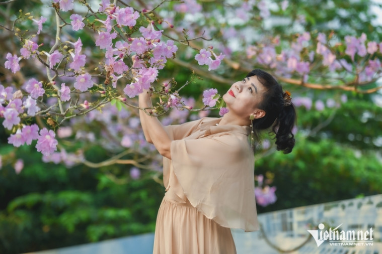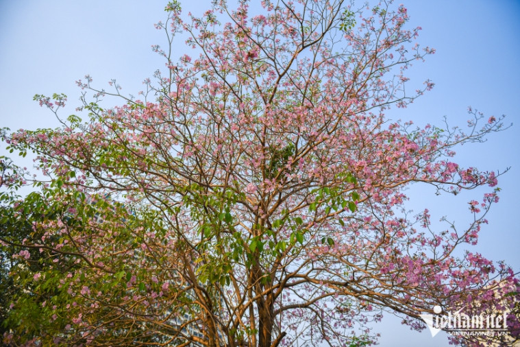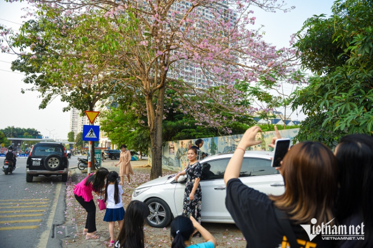 Nhiều người đi xa hàng chục cây số để "săn hình" với cây hoa phong linh hồng đang nở rộ, đẹp mơ mộng tại đường Phạm Văn Đồng, Hà Nội.