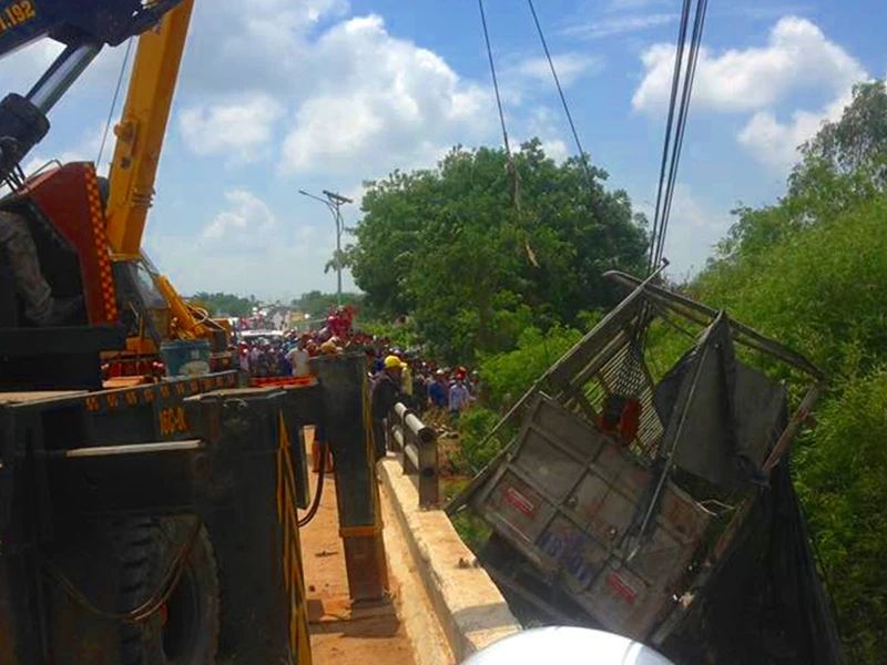 Những ô tô tải rơi xuống cầu Ông Hạnh được cẩu lên. Ảnh: PN