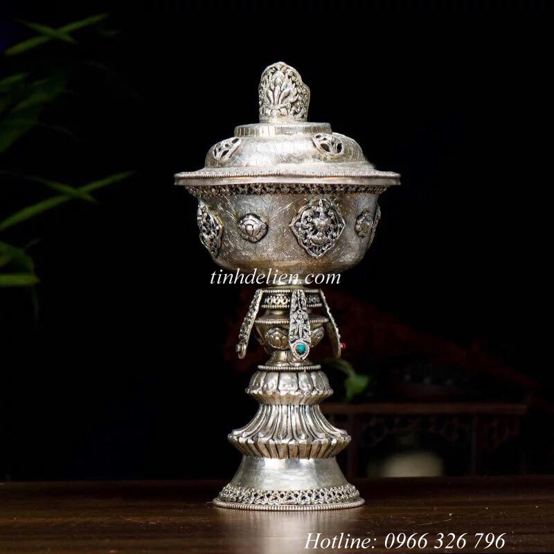 CHÂN ĐÈN BƠ CÚNG PHẬT CÓ NẮP THÔNG TIN SẢN PHẨM : Tên sản phẩm : Chân Đèn Bơ Cúng Phật Có Nắp Mã sản phẩm : TD 152 Chất liệu : đồng mạ bạc Giá : 6.999.000 / 1 Cái Kích thước : cao 30 cm ; đường kính 6,5 cm Trọng lượng : 0,95 kg / 1 cái Quy trình sản xuất : Handmade(thủ công) Phong cách : Tâm Linh Phật giáo Nepal / Tây Tạng Ý NGHĨA : Cúng dường đèn bơ là cúng dường mãnh liệt nhất bởi lẽ ánh sáng của chúng tượng trưng cho trí tuệ. Ngay khi ngọn đèn xua tan bóng tối, ánh sáng của ngọn đèn biểu hiện sự tan biến của bóng tối vô minh và chứng đắc trí tuệ sáng suốt của Phật. Dâng cúng đèn là cúng dường tánh thấy lên mắt Phật. Vì mắt Phật là mắt trí tuệ, nên chúng không có sự đối nghịch của sáng hay tối. Mắt thường của chúng ta, dù sao đi nữa vẫn bị che lấp bởi bóng tối của hai bất tịnh – Một bất tịnh thô là cảm xúc phiền não (ngã chấp) và một bất tịnh vi tế là sở tri chướng (pháp chấp). Phật không có tâm mong cầu đối với mọi món dâng cúng, nhưng chúng ta cúng dường để tích lũy công đức và trí tuệ cho chính mình.