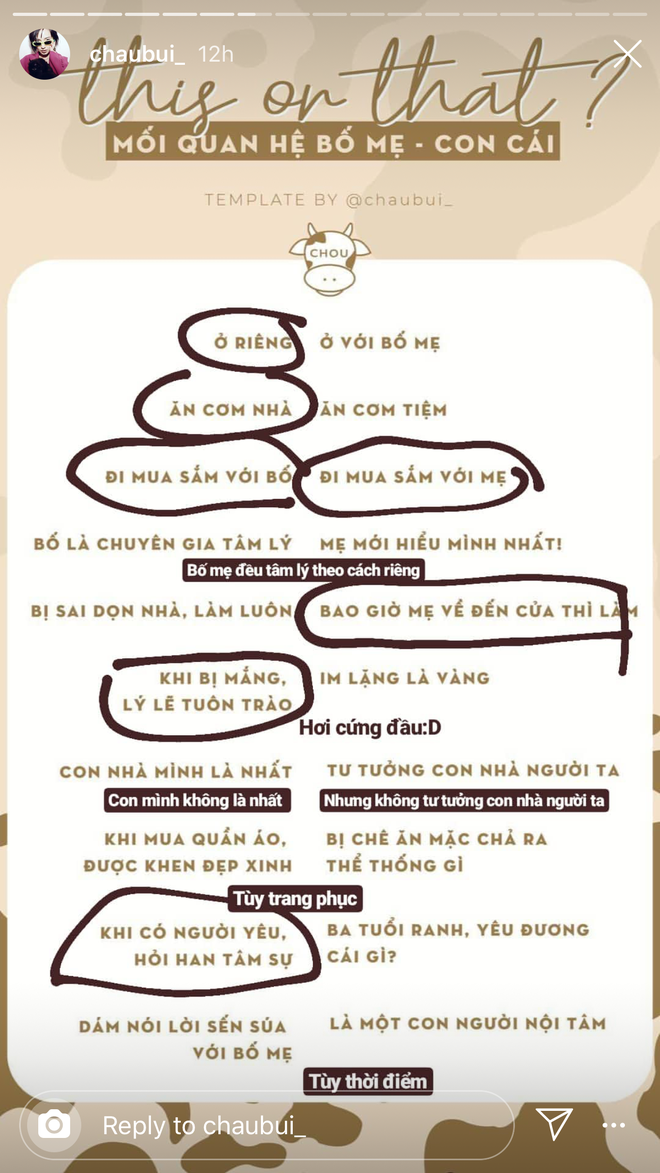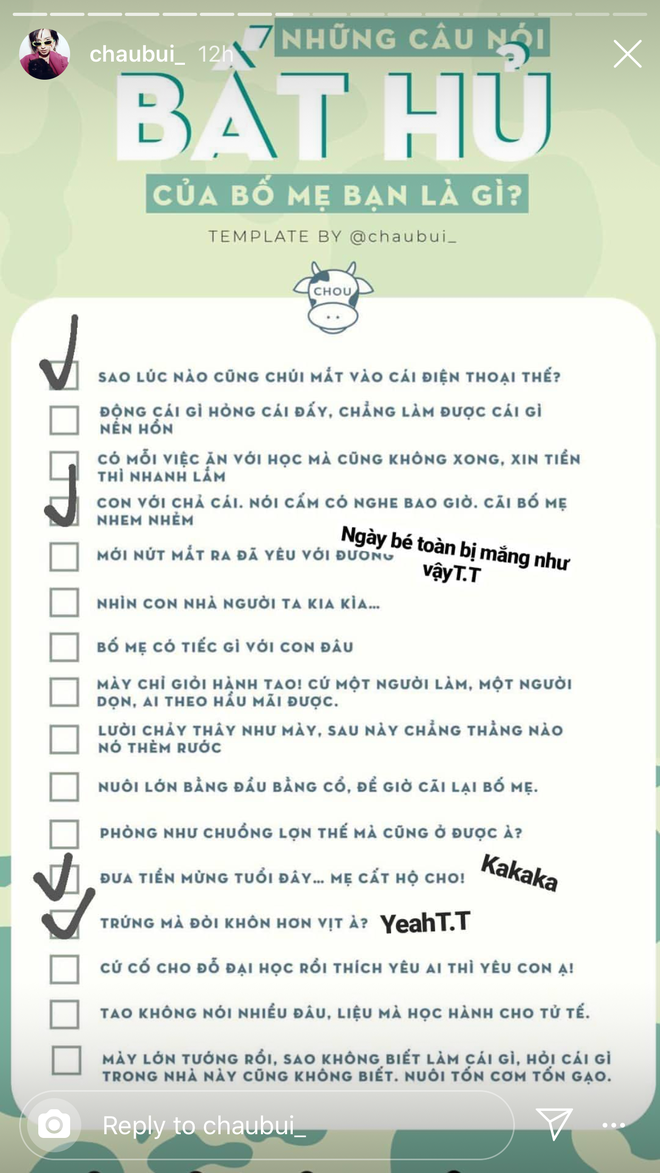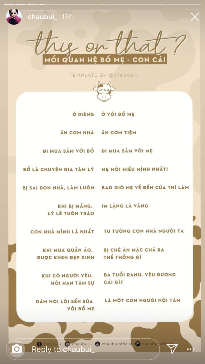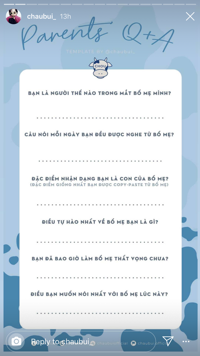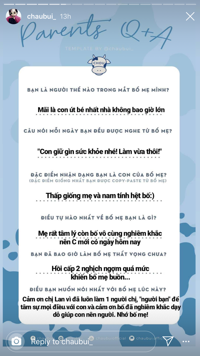 Bằng tất cả những câu trả lời này, người ta phát hiện ra thêm khía cạnh thú vị khác của Châu Bùi và đồng thời cũng nhận ra, Chou Chou yêu bố mẹ mình nhiều lắm. Cũng nhân đây thì bạn có muốn thử trả lời những câu hỏi trong template Châu Bùi đưa ra không? Thử xem để biết mối quan hệ của bạn và bố mẹ hiện tại như thế nào nhé!