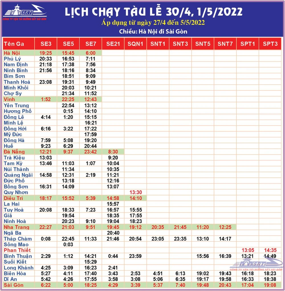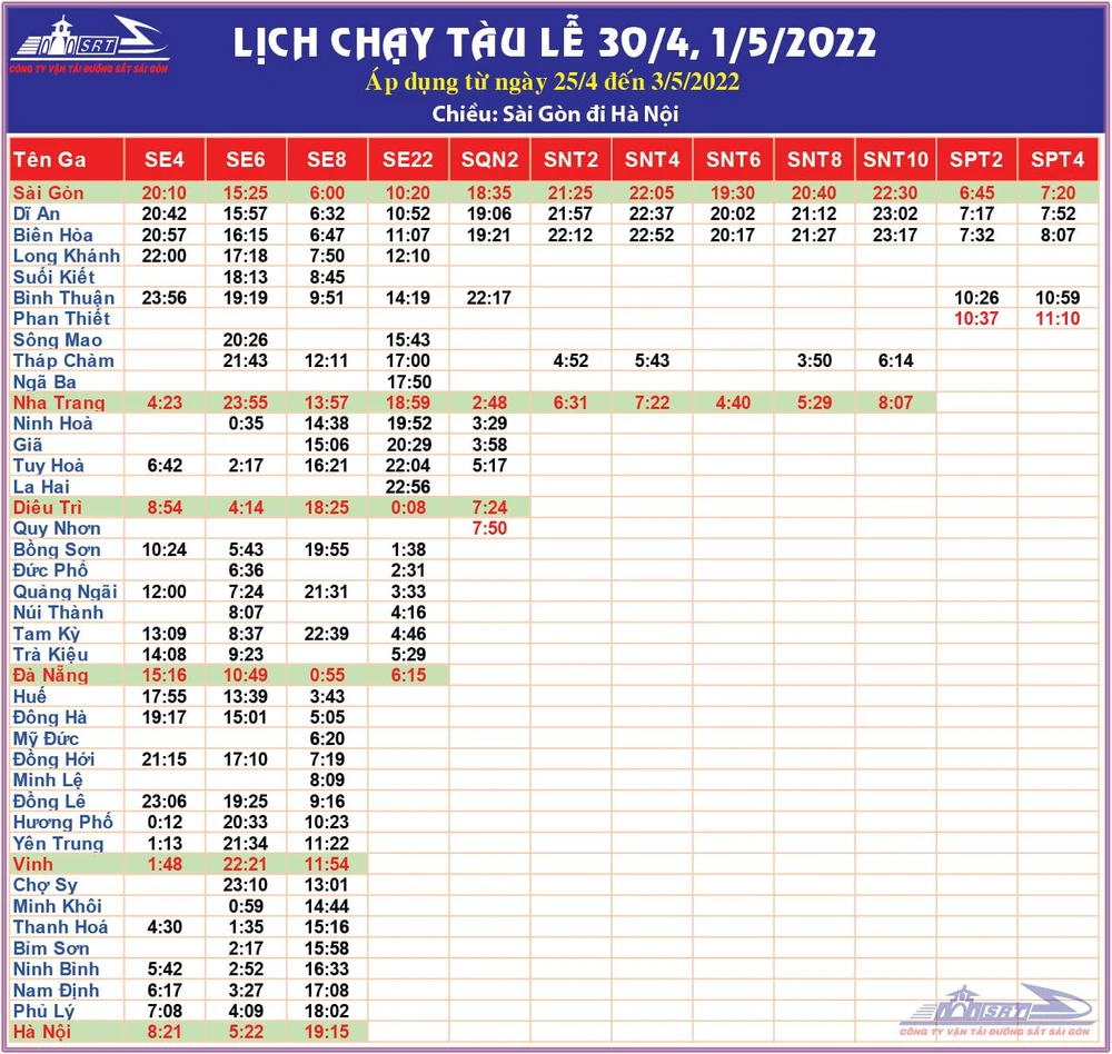 Dưới đây là chi tiết giờ chạy tàu dịp lễ 30-4 và 1-5: