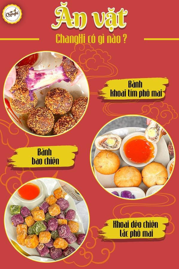 Bạn đã thưởng thức bao nhiêu vị chè đỉnh cao của CHANG HI rồi? Ai nói đi ăn chè thì chỉ có chè, CHANG HI còn có những món ăn vặt siêu hot từ nem chua rán cho đến bánh mochi khoai tím phô mai và gần đây nhất là khoai dẻo lắc. Thiệt là mờ lem!