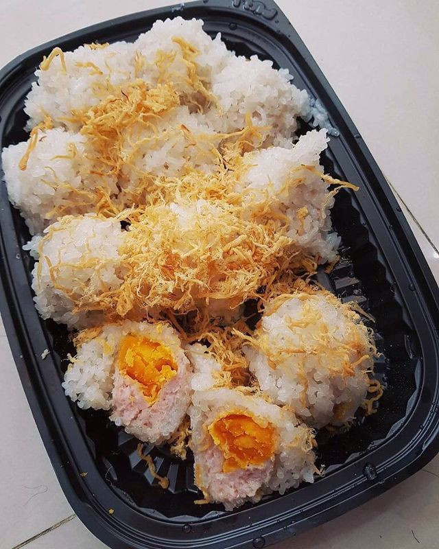 Không chỉ có bánh bông lan trứng muối hay bánh bao trứng muối, xôi cũng có thể có nhân trứng muối nhé. Xôi được nặn thành hình viên, ở giữa đặt cá thác lác bọc trứng muối, sau đó được bỏ lên chiên. Cục xôi tròn tròn, xinh xinh bên trong có trứng muối nóng hổi, tan chảy và bên trên phủ lớp chà bông mỡ hành ngon hết sẩy, ăn không ngán nhé.