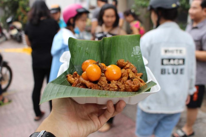 Món ăn hot hit trong thời gian vừa qua, khi mà được giới trẻ săn lùng nhiều nhất. Trứng gà non bùi bùi béo ngậy, thường được rang cháy với tỏi cho dậy thơm. Một phần xôi trứng gà non sẽ có thể ăn kèm với thịt gà xé, lạp xưởng, chả lụa, giăm bông, mỡ hành, tóp mỡ, pate quét lớp mỏng. Xôi mằn mặn nhờ ruốc ăn chung với cái đắng của gan gà và bùi bùi của trứng non nữa, ăn dễ bị “ghiền” lắm đó.